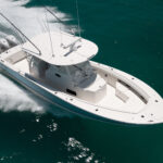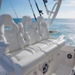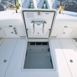 Regulator achieved all this room by using thoughtful design and an integrated engine bracket for the triple 425-hp Yamaha outboards. With the motors and bracket, the vessel stretches from a 37-foot, 7-inch hull to an LOA of 43 feet, 5 inches. Using a bracket gives the boat a more traditionally shaped transom, which houses the livewells, an insulated fish box and a fold-down bench seat. To make boarding easier, there’s a dive door to starboard with a quick-connect ladder.
