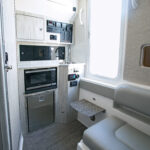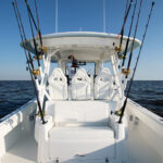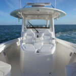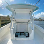 The cabin space in the console was much larger than I expected with plenty of head room and a U-shaped seat that has a filler cushion to turn it into a queen-size berth. There’s rod storage under the seats, and the AC pulls the return air over this compartment to help keep the space dry and free of that musty smell you get when storing wet rods inside. There is a wet head so you can take a hot shower, and a small galley.