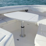 The electric table in the bow is an ideal spot to enjoy that hot lunch, and when you don’t need the table, it drops flush to the deck. There’s also a two-person lounge forward of the helm, and all of the storage areas are insulated so they can double as coolers.