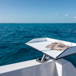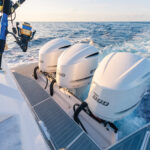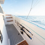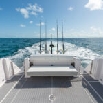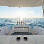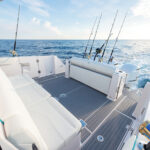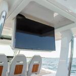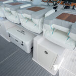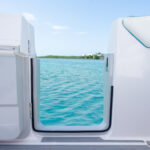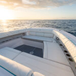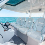 Upon walking onto the 38 SAV, it feels much larger than a 38-footer. The deck is laid out to maximize space, with no obstacles that could result in busted toes or traffic jams. The swim step wraps around both sides of the triple outboards, making it easy to get in and out of the boat. This bit of extra standing room will also come in handy when trying to clear the engines with a hot fish on the line. Two doors on either side of the transom and dual side-entry doors make boarding easy, whether it’s a guest stepping in from a dock or a big fish being plucked from the sea.