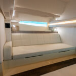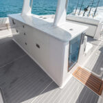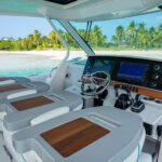 The company calls the 38 SAV a center helm design; it’s not a full walkaround center console. The port side offers a wide walkway and a set of teak steps on the starboard side provides access to the bow—or easy egress to high quays—when docking or anchoring. Four helm chairs are not just for sitting. The outward chairs swing around so you can watch the lures behind the boat, and all four seats fold flat for additional counter space when grilling out on the entertainment counter just behind the captain’s chairs. With additional seating in the bow, behind the entertainment center and along the transom, you can carry 15 passengers without stepping on each others’ flip-flops.