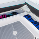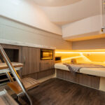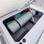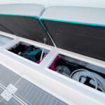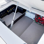 As for fishing features, the hardtop comes with reinforced mounts for outriggers, there’s a row of rod holders on the transom, dual insulated lockers and a pair of 16-inch Garmin displays at the helm. If you’re the type of person who would never consider buying a house that didn’t have a garage, you’ll love the 38’s lazarette. The hydraulic-powered deck lifts up to reveal the standard Seakeeper, all of your batteries and switches, the genset and enough storage space for gearheads who can’t resist the latest watertoy or fishing accoutrement.