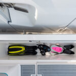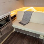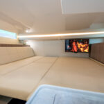 Down below, you see the Regal touch everywhere. With large windws for natural light, you never feel cramped in this comfy living space. A queen-sized berth up front and a convertible mid-cabin settee in the air-conditioned cabin make it the perfect escape from the heat. The full head with separate walk-in shower is something you don’t often find on board an open boat of this size.