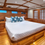 The ambiance of the entirety is both traditional and yachty. And there’s also a high level of fit and finish, in no small part due to the boatbuilding tradition that’s distinguished the Pine Tree State for virtually all of its long, storied history. The incorporation of raised-panel doors that replicate translucent shoji screens both enliven and brighten the staterooms belowdecks, and sightlines from the upper deck are nearly unlimited. Indeed, thanks to the stainless-steel-framed doors and curved corner windows at the rear, as well as the three expansive windshield panels forward and the tall, lengthy side windows (with a door opening onto the starboard side deck at the helm), the main deck’s bright, vibrant vibe is almost fully circumscribed by glass.