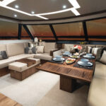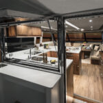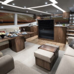 We sidestepped workers inspecting the engine room, walked through an exceptionally large cockpit into the aft galley that can easily service the cockpit through a swing-open window, and the salon forward. The salon, I couldn’t help but think, feels very masculine. That’s not just because of the enormous TV built into the galley counter; there’s also high seating and dark wood.