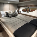 Accommodations for the 68 are comprised of a forward VIP, a guest stateroom with twin berths, and a full-beam master amidships. My favorite aspect of the 68’s accommodations is in the master, which features a small dinette to starboard next to the window and port. It looked like a great spot to watch the sunrise without going out and greeting your guests.