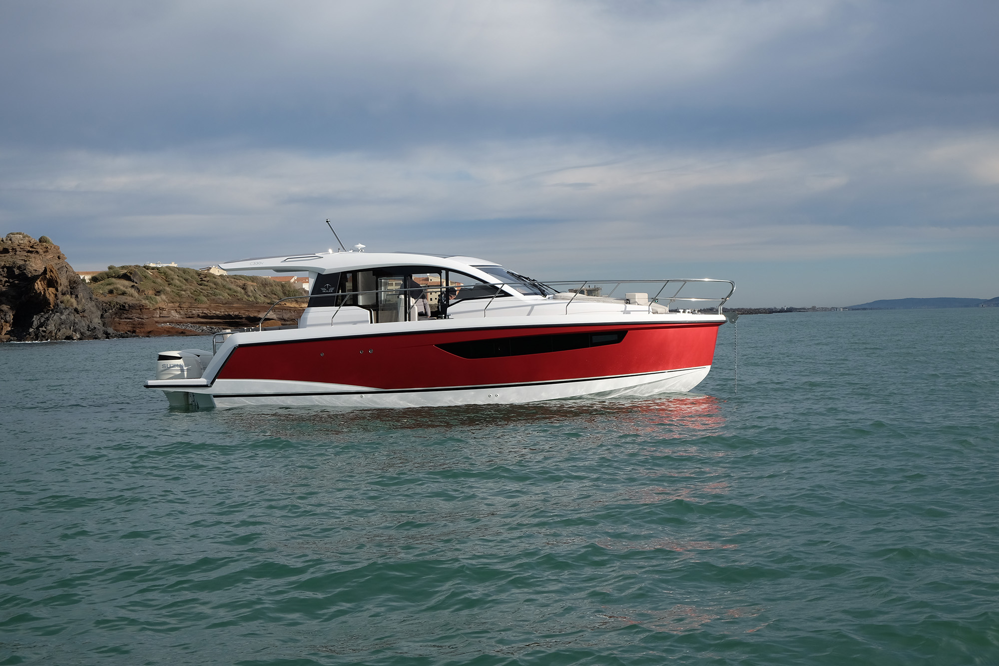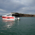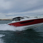 Two 300-hp Suzuki outboards were bolted to a specially designed bracket on the stern, purring away quietly and set so low down that from the salon you couldn’t even see them. I had tested the 330 before in its sterndrive configuration and been impressed by the layout. In particular the overall design struck me as clever: This is an asymmetrical boat, with a wide, practical side deck to starboard and a much