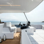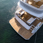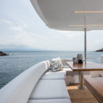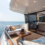 Outside, broad side decks lead forward from the cockpit, which comes with a quite creative variety of layout options, to the foredeck sunlounging area. There is another acre or so of upholstery up on the forward half of the flybridge, which also has seating aft, along with an alfresco galley behind the upper helm. The hydraulic stern platform comes as standard.
