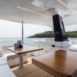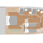 She has three cabins and two heads down below, and with a rational, rectilinear layout there is no wasted space across a pretty generous beam of just over 16 feet. So, the amount of floor space in the midships master feels quite luxurious, the beds are all 6 feet, 4 inches long or better, and the minimum headroom you’ll find anywhere is 6 feet, 5 inches. Stowage space is good too, notably in the master and VIP cabins, but even the starboard twin has a generous hanging locker. The heads are of a similar size, each with a roomy shower compartment.