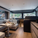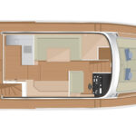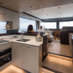 On the main deck, those vertical windows offer an almost all-round view, whether from the helm or from the sofa and dinette. The galley, although not especially large, is sociably placed aft between the cockpit and salon, and feels spacious and practical, with useful stowage space and a good sized fridge across on the starboard side. Two contrasting interior design schemes are available.