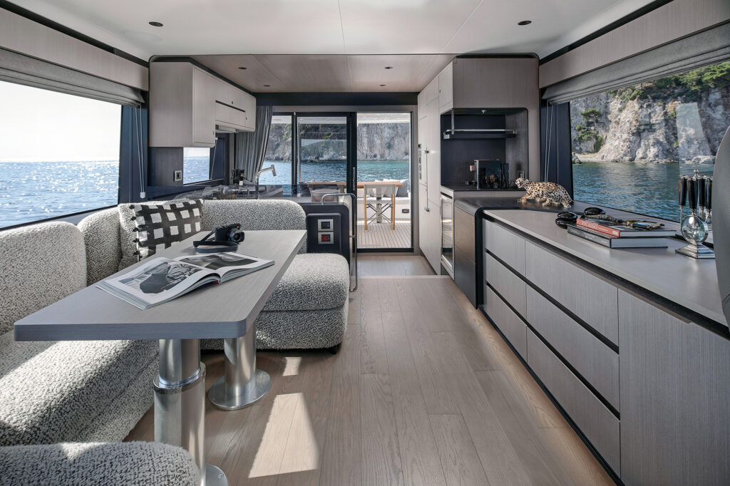Sirena revamped the 60’s outdoor and indoor spaces. The new model has a longer swim platform and wider stairs that lead to the cockpit, with remodeled seating that offers more stowage. I arrived early on the morning of her sea trial and made my way into the redesigned cockpit, which was fully covered by the boat deck. I liked the warm, teak soles and teak-clad bowrails that continued up the walkaround side decks, and the roomy C-shape settee with a dining table on centerline, flanked by beefy cleats and winches.