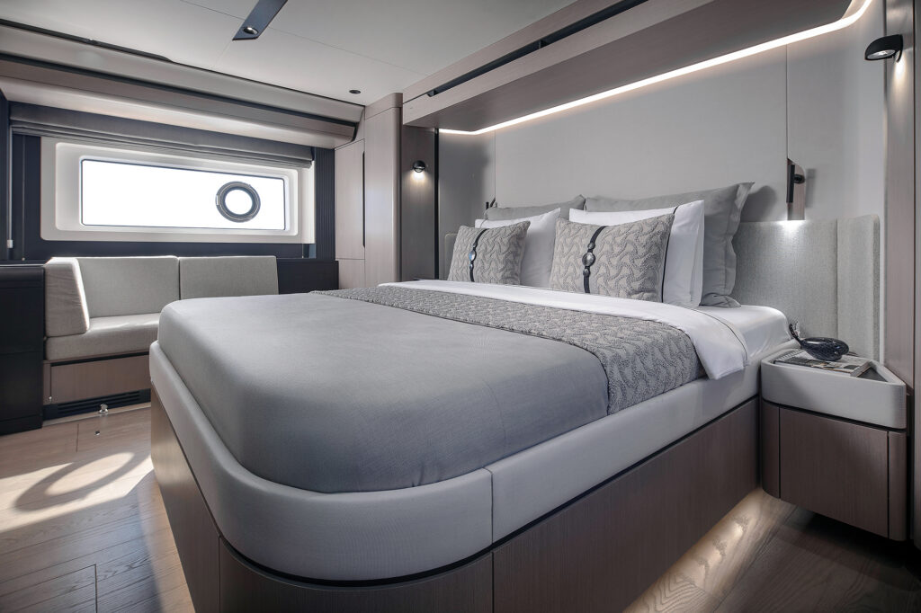 Stepping into the salon, a clear path leads past the amidships dinette to the portside lower helm’s updated seating. The belowdecks companionway, to starboard, is now more compact, allowing for a washer-dryer to tuck in below the stairs. Belowdecks, the configuration remains the same with an amidships, full-beam master stateroom and a VIP in the bow with queen berth. The third stateroom that separates them has sliding berths that can be configured as a double or twins. There’s also a single crew cabin accessible from the swim step.