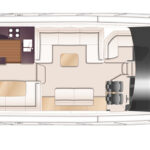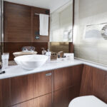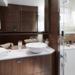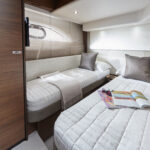Like its predecessor, down on the lower deck the new 62 comes with three cabins and three heads and limited possibilities for changing anything—although there is the option to fit a second door to the port head compartment, to allow it to serve as a day head. And with the addition of an electrical sliding mechanism to the inboard berth, the twins in the starboard cabin can be converted into a double. You can also have a small twin-berth crew cabin fitted in the stern.
