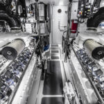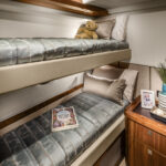 The Classic layout includes an additional fourth guest cabin with full-sized pullman-style beds, a cedar-lined hanging wardrobe and a bedside table. The third and fourth cabins share a head located on the port side, forward of the twin cabin. With the Presidential layout, you give up the guest cabin to starboard in exchange for the larger master, but you get a dedicated crew cabin, complete with head/shower. (On the Classic this space is a storage and utility room.) Access is via a staircase from the port side of the salon, with a watertight bulkhead door providing entry to the engine room. The spacious full-height engine room has eye-level engine systems monitors and remote controls. Systems and components are close at hand, so you don’t have to be a contortionist to access them.