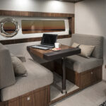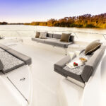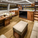 The extra length of the cockpit allows for more storage options, yet it’s still a roomy space for relaxing and entertaining. A large grill is set forward in cabinetry located below an elevated mezzanine deck. The elevated alfresco mezzanine forward of the cockpit includes a dining area that’s protected by the bridge overhang. A bar with two swivel stools is set below the awning window, creating additional informal seating in the mezzanine.