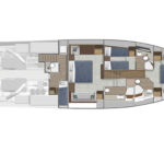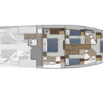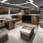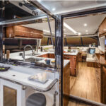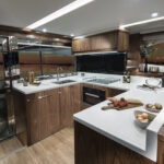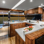 In the cabin, there’s a contemporary, open salon and a U-shaped galley to port that features varnished walnut cabinetry, a four-burner induction cooktop, a large convection microwave oven and a dishwasher. The galley also offers exceptional refrigeration capacity with four drawer-style fridges and two freezers. It’s a galley suitable for a MasterChef winner.