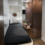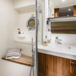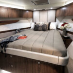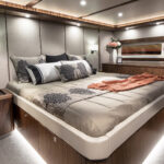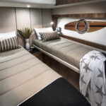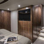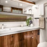 The master in both the Classic and Presidential options features a king-size bed and bedside tables with leather inlays. There are his-and-hers cedar-lined hanging wardrobes on either side of the stateroom. The VIP guest stateroom forward includes a walk-around queen-size bed and a private en suite. The port cabin aft of the guest stateroom features twin single beds, which can convert to a double as the inboard bed slides across.