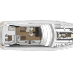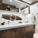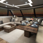 As for the accommodations level, there are two layouts available—the three-cabin Presidential version and the four-cabin Classic, both with three heads. The Classic offers a massive amidships master stateroom with en suite along the starboard side. The Presidential features a larger full-beam master stateroom with en suite in the starboard forequarter. A private sitting area on the starboard side can serve as an open workstation, make-up bureau or breakfast retreat.