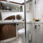I loved the layout of the salon. I felt the same way about the enlarged cockpit and even the master stateroom, but when I entered the flybridge, I was in a different world. I don’t like the phrase “state-of-the-art,” but it’s probably the best way to describe the helm station. Set into hand-stitched leather was a comprehensive engine and control system, complete with a Twin Disc electronic joystick system (EJS) and three 22-inch navigation screens. (You can have up to four.) At the helm was a Norsap seat for the driver and a port side companion seat.