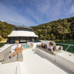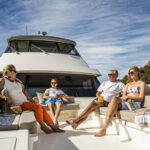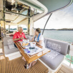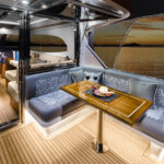 Guests can relax on lounges along the entire starboard side of the bridge. A distinctive feature of this space is a fold-out double bed under the aft lounge. This will come in handy if you have a captain or some additional guests on board. A stainless-steel-framed glass door and awning window connect the flybridge with a large aft deck complete with a dedicated engine control station and an alfresco dining area with an L-shape lounge, wet bar and space for two stand-alone dining chairs.