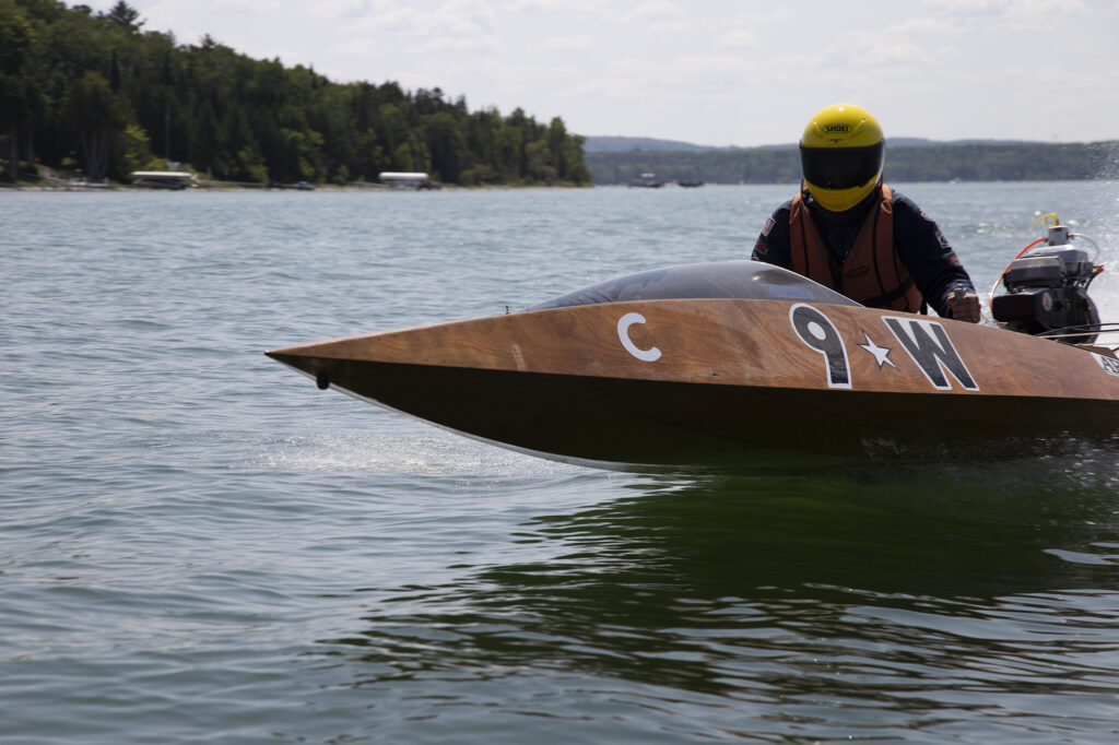 I’m wearing a borrowed cut suit and holding a canary yellow helmet. Climbing into the race-flag-checkered stock outboard provided by Bill Allen—a world champion hydroplane driver out of Boston—he gives me a thumbs up. “It should be solid for a new guy,” says Bill. “Just don’t lose sight of the pits.” I close the helmet visor and choke the deadman’s throttle. Bill rips the pull cord and the engine roars to life as I take off on a beeline toward the middle of Burt Lake.