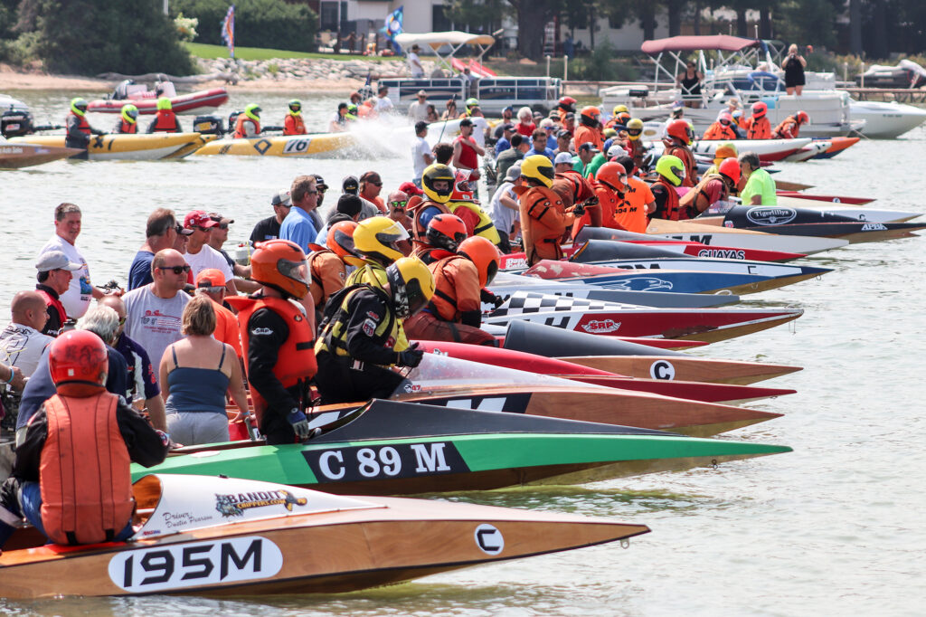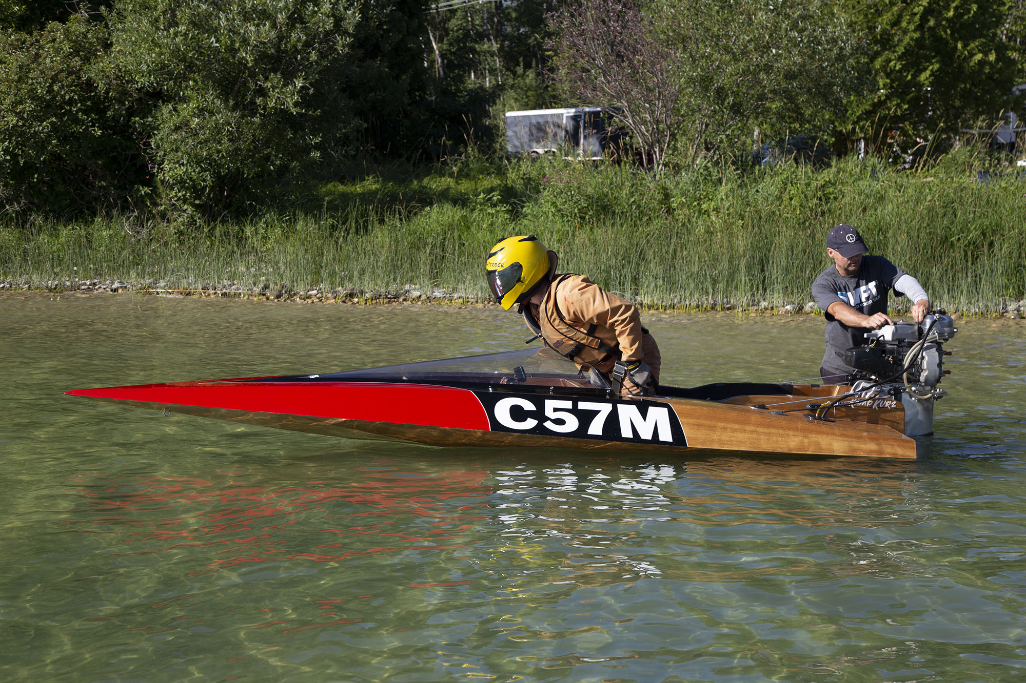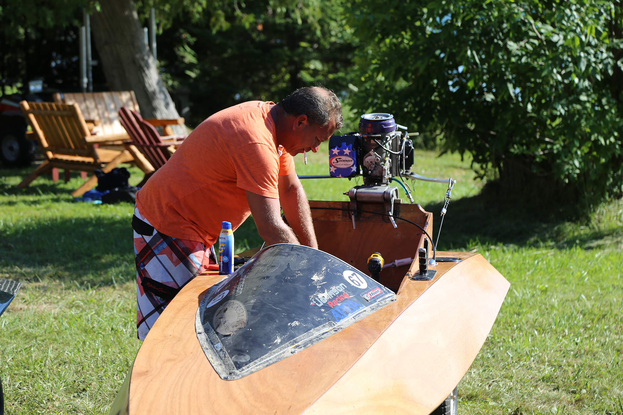 It’s morning and the lake is still, but already the buzz of engines is coming from the water. Racers flock to Camp Kurz, the marathon’s unofficial staging area, to go through their mental checklists before race time. Cut suits designed to protect the wearer from bodily harm dry on clotheslines as drivers huddle close to their engines, tinkering with their outboards, before taking to the water to check rpm and prop pitch.