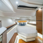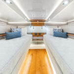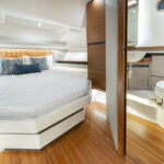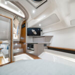 The starboard side deck provides access to the bow. There’s also access on the port side via a raised egress, which will also come in handy when boarding the boat from a tall bulkhead. Using a single side deck makes the cabin more voluminous. The master berth is situated forward, and the bed lifts up to reveal a large storage area. The forward cabin doesn’t feel cramped at all thanks to 7 feet of head room. The head offers a separate shower stall. Two more berths are situated aft. These don’t have much headroom, but they’re comfy, and you can slide in filler cushions to make it one large bed. An optional Seakeeper 6 and the standard Cummins Onan 9 kW diesel genset live in the machine space belowdecks.