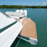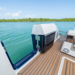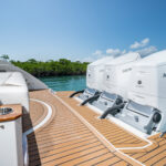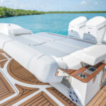 “We optimized the boat to that propulsion package,” said Andrew Bartlett, director of design at Tiara. By zeroing in on a single power package, Tiara did not have to compromise any elements of the design for multiple engine installations. The benefits of this approach show up all over the boat. Because the motors have a built-in steerable gearcase, there are no hydraulic or electric steering actuators by the engines. The splashwell is free and clear to provide more room to enjoy the “teak beach” in the stern.