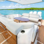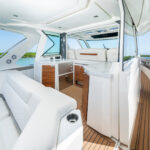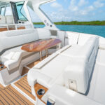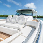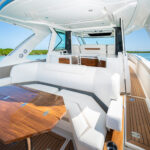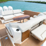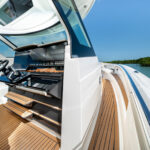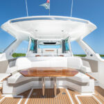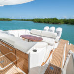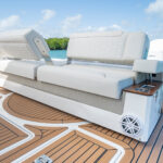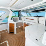 My favorite element of the 48 LS is the use of outside deck space. The boat is laid out with outdoor entertaining zones so you can have a party in the back and a party in the front, or anywhere in between. The aft deck features a port side, drop-down terrace with a built-in ladder that extends 4 feet, 6 inches underwater. No more navigating wobbly rungs to get back in the boat; this one even has handles. There’s a dive door on the starboard side as well, perfect for stepping aboard from a floating dock. The rotating lounge, which has become a Tiara hallmark, provides another layer of flexibility on the 48. One position opens up some more aft deck space, while the other position brings you closer to the dining table that’s shared with an aft-facing bench. The split backrest adjusts electrically for sitting or lounging.