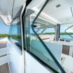 Thanks to electric-sliding fiberglass doors with tempered-glass windows, you can enclose the helm, bringing the noise levels down to a yacht-like hush. This also lets you enjoy the full blast of the air-conditioning. A roll-down isinglass partition behind the helm seats can be closed with the push of a button (no snaps or zippers) to give this spot full protection. You access the cabin from the enclosed helm via a sliding door. You don’t have to leave the helm and make your way to a side-door cabin entrance, like you do on many center consoles. This provides an added layer of security, and you don’t have to get any spray on you as you try to wedge yourself into a small entryway.