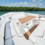 The helm layout is sleek and aesthetically sharp, thanks to a black glass-dash complete with teak accents. The large, single-piece windshield is unobstructed and makes visibility a non-issue. Hull number one had the latest-and-greatest Mercury electronic controls with auto trim and a small built-in screen to display engine data. The joystick made close-quarter maneuvers arcade-like easy, and I loved using the Heading Adjust, where a turn or push of the joystick lets you change course by one degree or 10. There’s also a bow thruster, though we didn’t need it. The console holds three Garmin MFDs, a 22-inch in front of the steering wheel and two 16-inch screens to starboard.