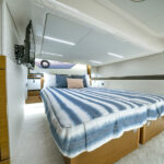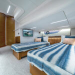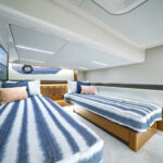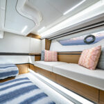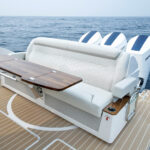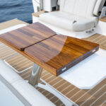 Vishey, Tiara’s director of marketing, approaches the portside bench seat to demonstrate one of the multiple “transformational” features on the 48 LE. She presses a button under the seat to release a locking mechanism, then slides the bench forward to expand the four-person settee by at least a foot, maybe two. The process, which is low effort, is the first step in converting the settee to a berth for an adult or two children.