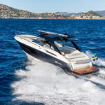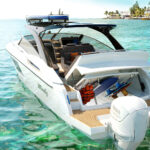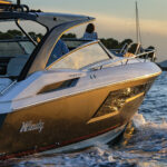 The 40 Camira I climbed aboard in Florida comes in an I/O version, but this particular one had twin Yamaha 450s that the builder hopes will appeal to the American market, and in particular the high-end dayboat sector that remains red hot despite downturns in some other marine spheres. The powerful Yammies are reported to give this 40-foot, 3-inch vessel a 45-knot top end that puts the express in express cruiser. Another American touch is the boat’s hardtop. Windy received feedback that we Americans well, how to put this gently? We don’t really feel the desire to raise a Bimini ourselves—so a fixed hardtop it was.