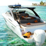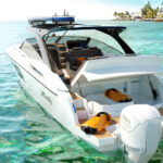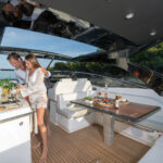 One happy effect of the outboards—besides the easy maintenance and badass aesthetic, is that this 40 Camira now has ample space for a garage. Inside of it were SeaBobs that amplify the boat’s bona fides as a pure fun machine. Interestingly, the garage also had a bit of a false bottom that pulled up to reveal a second stowage space that would be good for surfboards, snorkel gear, or even fishing equipment.