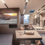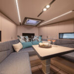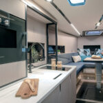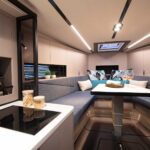 Down below, the Camira has a V-berth with a convertible table in the forepeak. A second cabin at amidships has the expected low overhead but still looked quite cozy for a snooze. A galley to port had a sizable Bosch oven that actually was usable, while magnetized wine glasses and mugs in the cabinets—a very cool touch—won’t go flying. Air-conditioning vents encircling the accommodations are designed to let cool air seep into the space, as opposed to arriving in an arctic blast. And lastly, easy access to the bow thruster through a hatch in the forepeak shows that Windy put thought into actually operating this boat, as one might expect from a region of the world where hiring a captain is an impeachable offense.