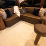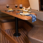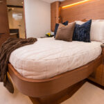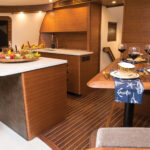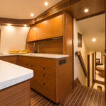 The interior is awash in walnut woodwork with a satin finish. “It’s a little boujie,” Winter said, using that word yet again in reference to the high-end animal hide leather used throughout the salon. I’d call the mix of rich wood finishes clean and classy. There’s plenty of room to enjoy a family get-together in the salon with an L-shaped couch to port and a circular peninsula by the galley with three stools. A tackle center sits on the starboard side.