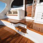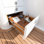 The mezzanine stands a bit higher than normal, with a tall step that allows for more storage and a higher vantage point to spot fish when sitting there and looking aft at the trolling spread. The lower mezzanine has cold storage, freezer, ice dump, engine room access and to starboard, a set of drawers with a nice surprise sitting in the bottom drawer. When you pull this drawer open you find a wing station with engine controls and autopilot. The controls look a bit low, but because the drawers are raised up on the mezzanine, Winters says the station is situated perfectly when standing on the cockpit sole. “It’s right where your hands are when you’re standing there,” he says.