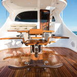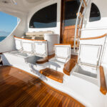 The cockpit is rigged for serious fishing, sporting an 85-gallon livewell in the transom with eight interchangeable tuna tubes. The owner does a lot of spearfishing and diving so there’s a boarding ladder that can be used for the 35-inch-wide transom door. The builder installed plumbing for two removable 70-gallon livewells that will sit on deck when fishing with live baits for sailfish. And the fighting chair can be switched out for a rocket-launcher pedestal with 12 rod holders. There’s plenty of storage space in the lazarette and a behemoth, 11-foot-long athwartship kill box. Below the deck lies a Seakeeper 16 with its own access hatch.
