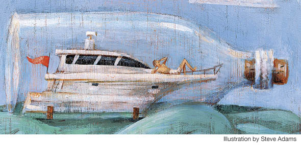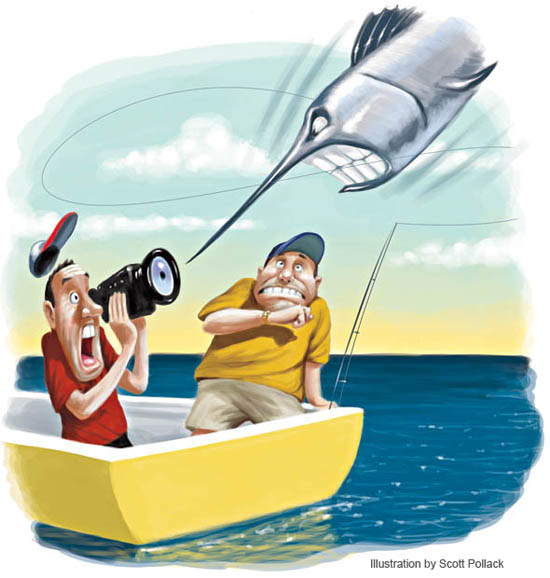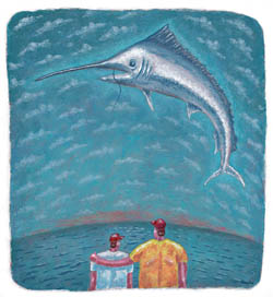 Middle-Aged Man & the SeaIllustration by Brian RaszkaForty-five miles off Marina Pez Vela, Costa Rica, I was recently fortunate enough to witness one of life’s intimate and constant dramas. Onboard were marina executive Juan Montalto, his sons Esteban, age 15, and Jose, 13, and the crew. We were trolling the