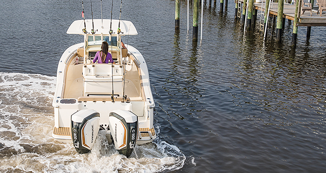 Evinrude’s new IDock joystick control makes dockside maneuvering more intuitive.