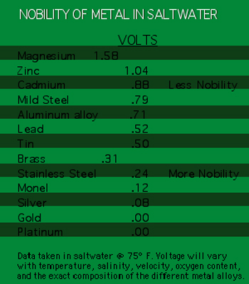 It’s a fair bet that every PMY reader knows about galvanic corrosion—or at least the basics of it: Drop two dissimilar metals into water and you get a transfer of ions that creates an electrical current (electrolysis), resulting in a process (galvanic corrosion) that eats away the “less noble” of the two metals. (For a list of common metals, see chart on page 47.)