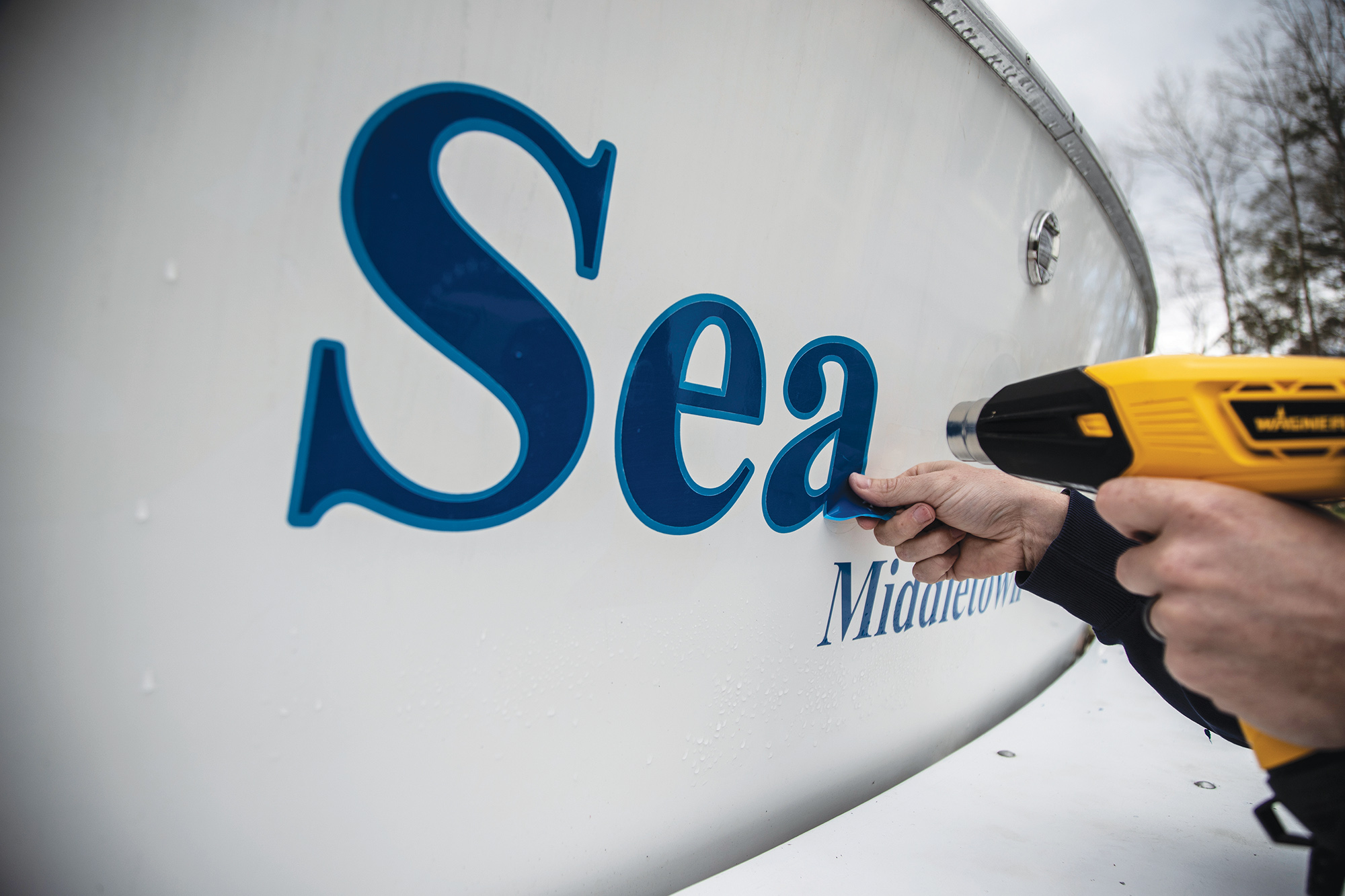 If the vinyl’s on a painted surface, it’s even more important to soften the adhesive first, in hopes of removing the name without taking paint along with it. Marine enamel is easy to touch up—but who’s going to apply vinyl to enamel? More likely the paint is long-lived linear polyurethane, a challenge to repair for DIY painters. Go carefully, and test the solvent somewhere inconspicuous first to ensure it doesn’t attack the paint as well as the vinyl. Maybe make an offering to King Neptune before you start peeling, too.