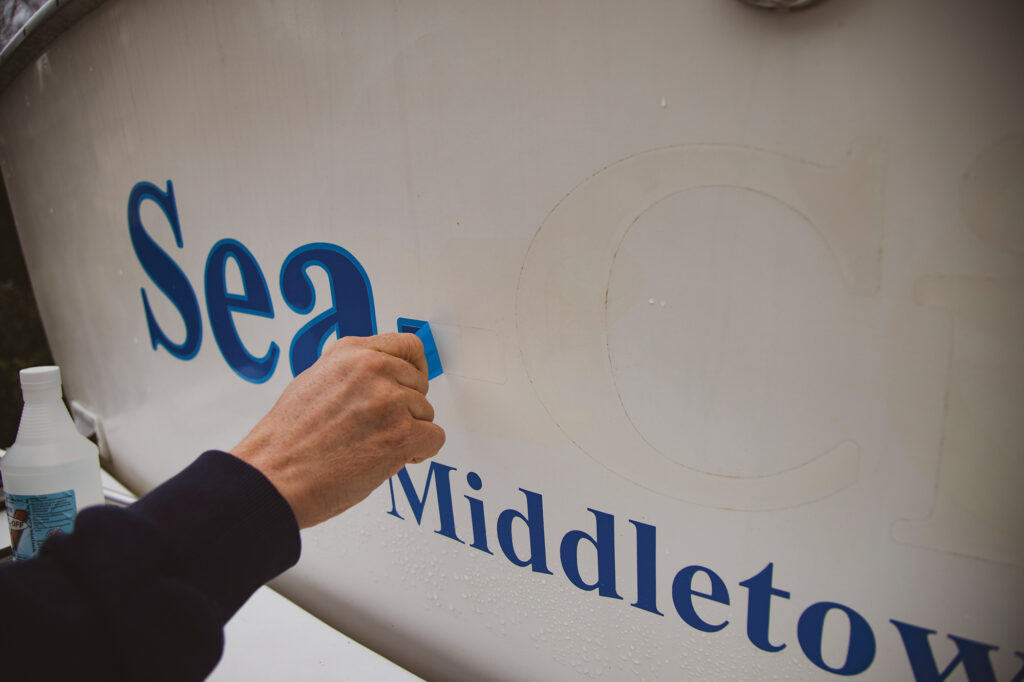 If the vinyl has been on the boat for many years, heat might not be enough, so use liquid. There are solvents that attack the adhesive to make peeling off the letters easier. Look for one that’s made for removing vinyl, not simply an adhesive remover—more about them later. Vinyl-Off, from CrystalTek products, is said to be environmentally friendly and biodegradable according to the manufacturer, and will let you peel off the vinyl and its adhesive in one step. The company says to warm the lettering first, then wipe on Vinyl-Off with a paper towel or rag and let it “dwell” for a few minutes. The solvent penetrates the vinyl and attacks the adhesive, so old, tough vinyl might need more dwell time, or a second coat of Vinyl-Off. Then warm the vinyl again and peel it off; most of the adhesive should come off, too.