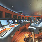 But baby blue—that’s a new one. Whatever your opinion of its aesthetic merits—and I happen to think it looks terrific —you’ve got to admit that it’s different. But if such a cuddly hull color leads you to expect an interior of wipe-down furnishings and Disney wallpaper, you’re in for a pleasant surprise. Styled by the French designer Alberto Pinto, Madsummer’s interior is thoroughly grown-up, with an interesting mix of woods such as soucupira and platane, interspersed with fabric bulkhead linings and leather detailing. These choices are not merely a designer’s whim—Madsummer’s American owner previously owned, and loved, the elegant 171-foot Amels-built Lady in Blue, and many of these details are intended to harken back to the earlier vessel. According to Pinto, “He wanted something that would remind him of her. It had to be a young and sporty yacht.”