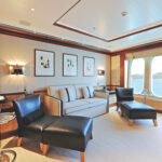 The owner lives on the upper deck. He can enjoy a private outdoor area, sheltered by the helideck, and a generous circular dining space aft enclosed by sliding-glass doors and equipped with a table that can seat up to 14. His spacious private saloon is served by its own substantial pantry, while the owner’s suite takes up most of this deck’s forward sections, with his and her bathrooms—featuring the unusual choice of sycamore for the floors—as well as an office and a children’s bedroom on the port side.