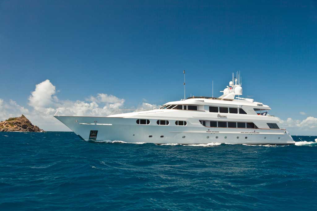 Encore’s successful charter program began well before the current owner bought her five years ago. But, the new owner is passionate about his yachts, and he wanted Encore to offer the best charter program out there. So he started with an interior redecoration of the main saloon as well as some more substantive projects. “It had a darker, masculine interior prior to them buying it,” Hodges says. “The owner and his wife came in and they changed a lot of the fabrics and they really brightened it up a lot.” Even more appealing were the aforementioned substantive modifications. “They added some things like [Naiad at-anchor] stabilizers—that was a pretty big deal,” Hodges continues. “They put the VSAT system on the boat, so now we have Internet under way and at anchor.