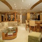 The Frains enjoy cruising with children, so there are well-thought-out seating areas in the main saloon (pictured here), galley, and formal dining area.