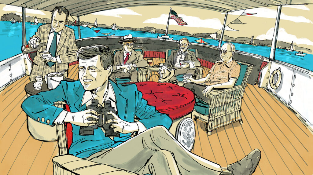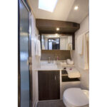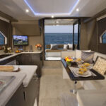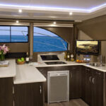 The saloon dinette and galley are arranged for easy mealtime table service.