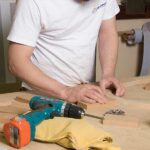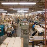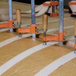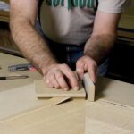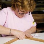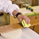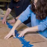The blue tape is being used to help the craftspeople align the wood grains for one long panel.