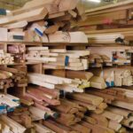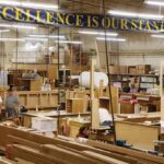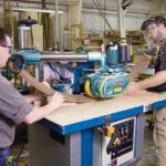 It takes two to properly trim this curved piece of wood; special machines are on site to address a variety of particular needs.